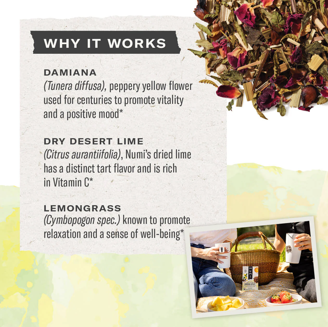 A zesty blend of Damiana, desert lime, lemongrass, lemon balm, and licorice root, it is a refreshing boost of positive energy in a cup with its bright, lemony flavor.