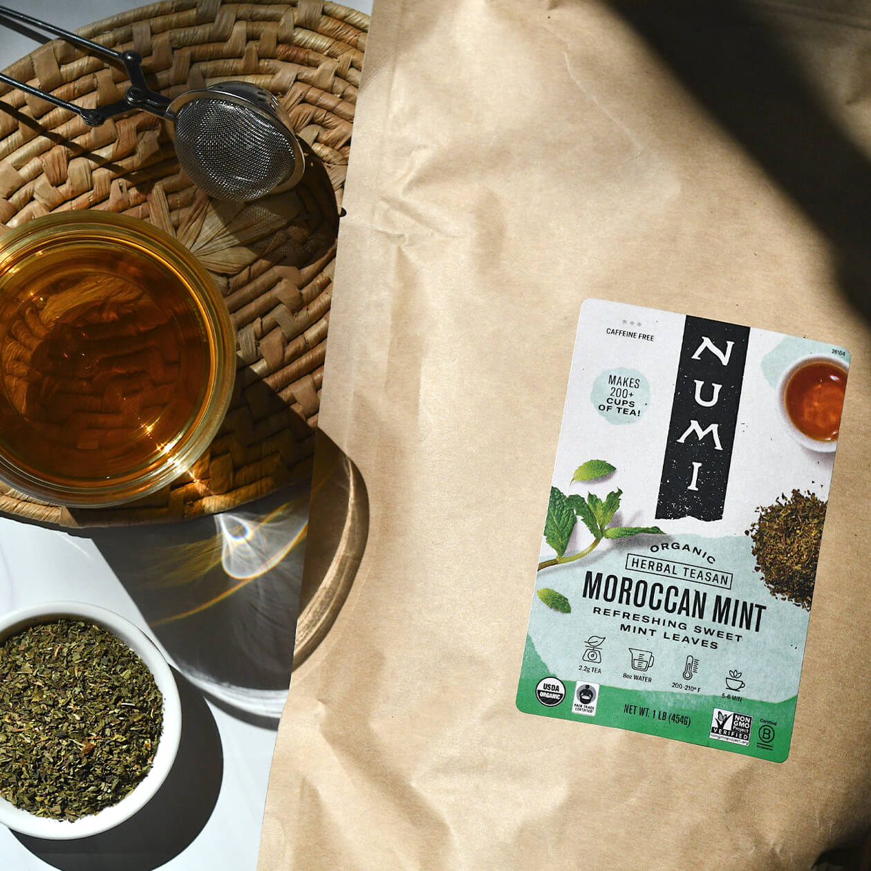 Our organic Moroccan Mint, known as "nana mint," flourishes in North Africa. With a flavor as light and lively as a newly picked leaf, it has a sweet spearmint flavor that is refreshing and soothing any time of day.